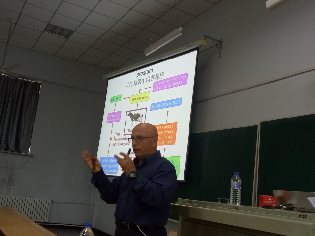 Shoshani教授首先介绍了以色列过去关于农业方面的基本现状,包括以色列特殊的自然气候,以及在农业方面多年的发展与研究,通过了高科技的发展和技术化的管理,使其农业经济方面都有了很大的提升;其次,Shoshani教授还就“以色列奶牛技术及管理”“基本数据和营养及饲养情况”两个相关主题,做出了更加详细的讲解,使研究生们对其奶牛场的饲养程序、环境条件以及一些重要指标等有所了解;最后教授又讲解了以色列农场的现代化管理技术,通过高科技自动化管理,数据的自动化采集,使其奶牛的生长状况以及环境条件及时得到了快速的优化,降低了疾病传播的风险率,且牛奶产量增益显著,同时也节省了大量的人力、物力、财力,并在最后做了关键性总结,使研究生受益匪浅。