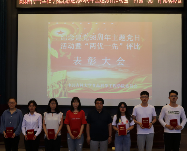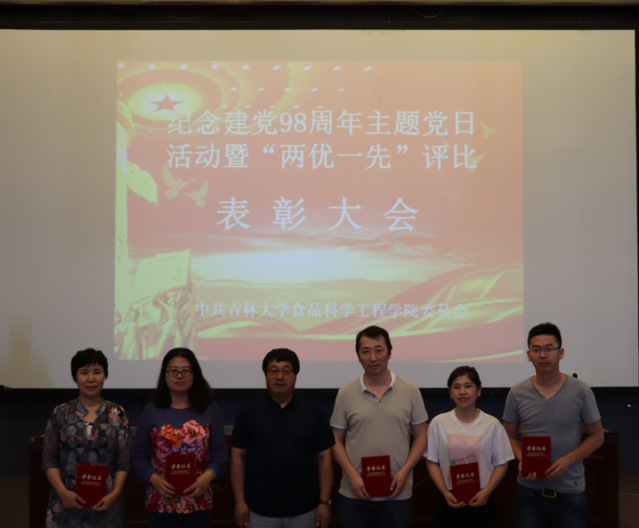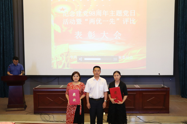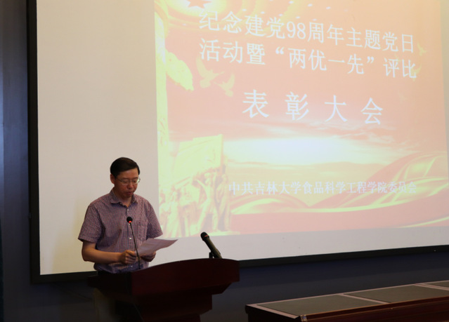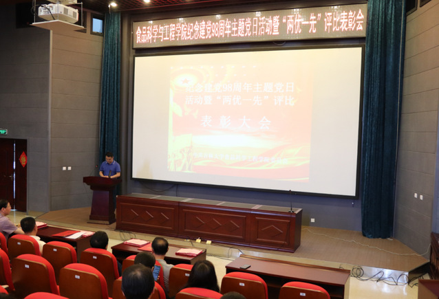 在图书馆二楼学术报告厅举行庆祝建党九十八周年主题党日活动暨“两优一先”表彰大会。学院全体教工党员、学生党员参加了此次会议。会议由学院党委副书记梅士伟同志主持。