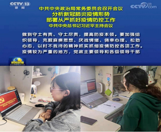 首先,由支部书记宫景玉领学了习近平总书记在中共中央政治局常务委员会上有关抗疫的重要讲话精神、省委组织部有关倡议书《致全省各级党组织和广大共产党员的一封信》和校党委组织部《致全校各级党组织和广大党员的倡议书》。号召支部全体党员、积极分子要认真领会并落实习总书记的讲话精神和两个倡议书,要坚定疫情防控必胜信心,自觉执行静态管控措施,严格执行学校的防疫政策,落实居寝防控措施,上好网课不荒废时间,尽好本分当表率,充分发挥“我是党员我先行”的先锋模范作用。