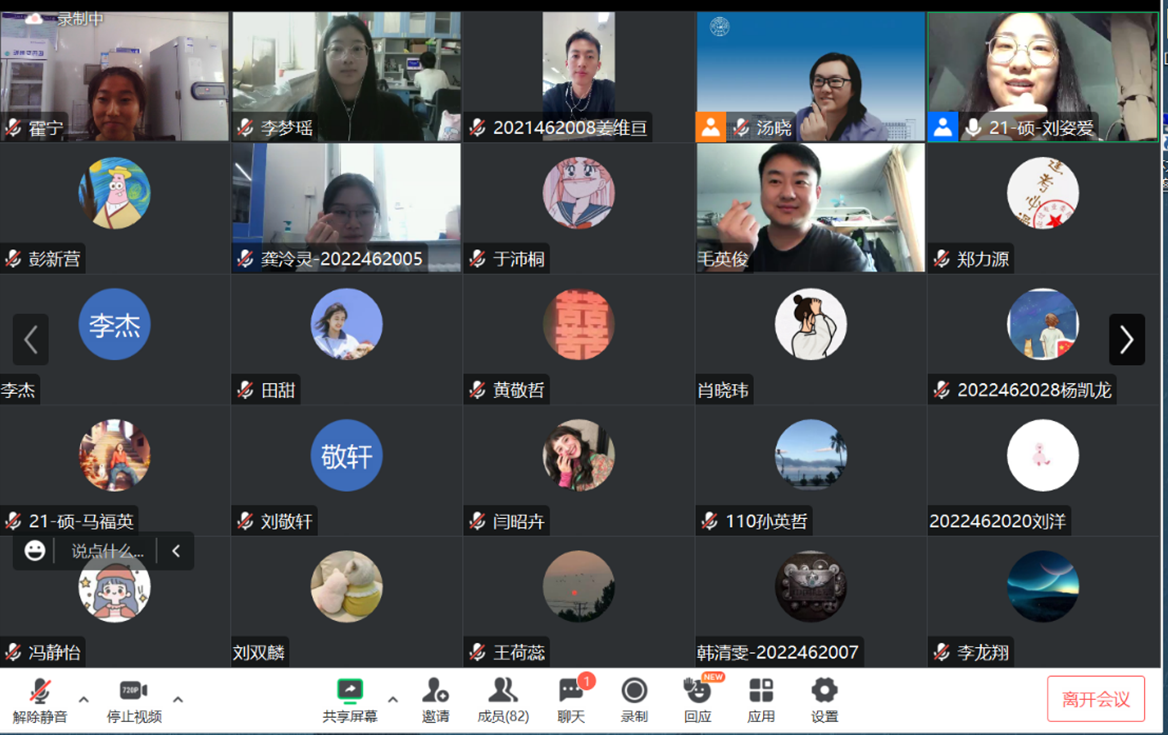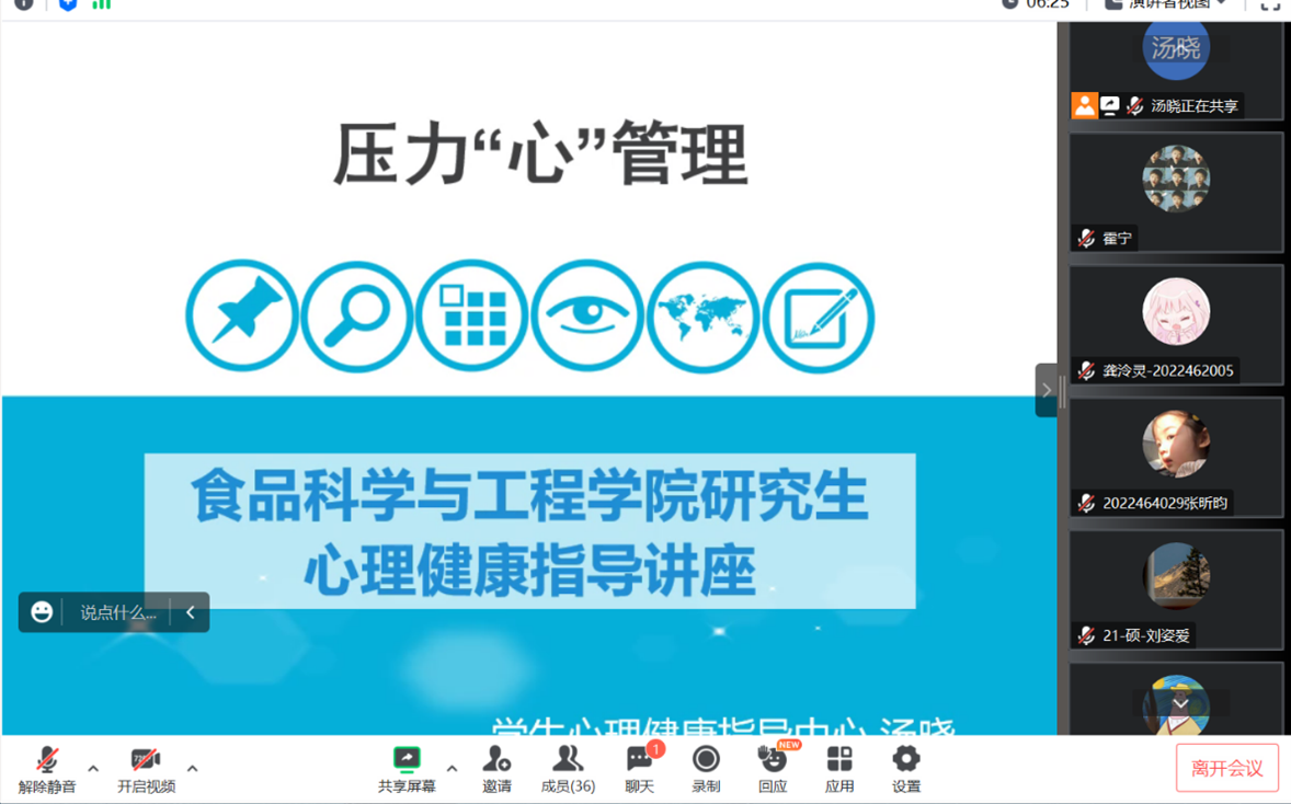 研究生正确认识压力、对待压力,促进身心和谐发展,在学校党委研工部的大力支持下,学院研办于6月6日下午14:00以《压力“心”管理》为题开展线上心理健康指导讲座。此次会议主讲人为心理健康指导中心汤晓老师,食品学院80余名研究生参与此次会议。