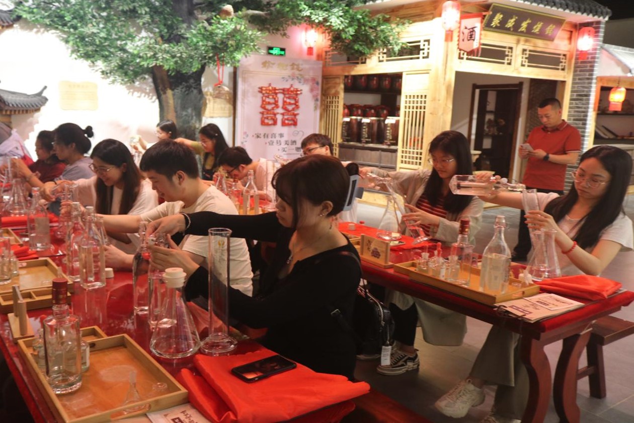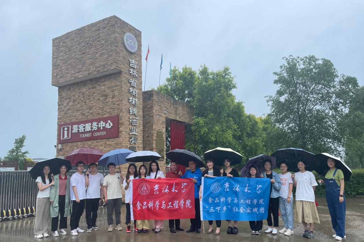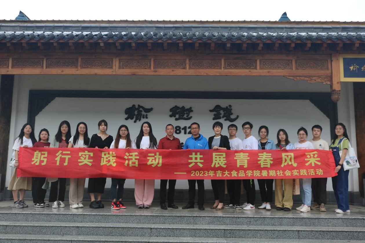 “老人七十仍沽酒,千壶百瓮花门口。道傍榆荚仍似钱, 摘来沽酒君肯否?”榆树钱酒文化可追溯至唐代,吉林省榆树钱酒业有限公司位于素有“天下第一粮仓”之美誉的榆树市。实践团队抵达公司后,在工作人员的带领下,参观了由八个主题展馆构成的榆树钱酒业酒文化博物馆,包括饮水思源、榆树故事、珍宝馆、墨宝寄情、红色基因、榆树老街等;了解到了榆树钱酒起源于1812年,七代传承,二百年工艺,其酿造技艺已列入吉林省非遗;品尝了榆树特色小吃干豆腐、体验了自助调制白酒,在勾调过程中,师生们亲自动手用两种原酿基酒和酸、甜、陈、香四种调味基酒勾调出自己专属口味的白酒;随后,实践团队来到了榆树钱酒业的酿造车间,品尝了刚出锅的原浆酒和独特口感的酒糟鸡蛋。榆树钱老窖池工艺拥有国家专利,窖池中庞大的微生物菌落群所产生的的酸类、酯类等物质决定了白酒的整体风格。正是榆树钱酒业在悠久的酒文化历史底蕴和传承精髓的基础上与时俱进,才成为醇厚绵甜、甘冽爽净的北派香型代表;最后,实践团队参观了酒海群、私人酒窖,解说员讲解到榆树钱酒海采用长白山百年以上树龄的优质黄花松木,辅以麻纸、鹿血等制成168层内胆,历经100多道工序,纯手工制作300多个时日。基酒经酒海贮藏再入陶坛贮藏后,具有独特的“美人松香”、“老酒陈香”、“蜂蜜甜香”等融合的酒海香型。榆树钱酒业的私人酒窖被誉为“北方最大私人酒窖基地”,在这里可以定制、封坛榆树钱原浆美酒,并把回忆和祝福注入其中,让美好祝愿在岁月中发酵。