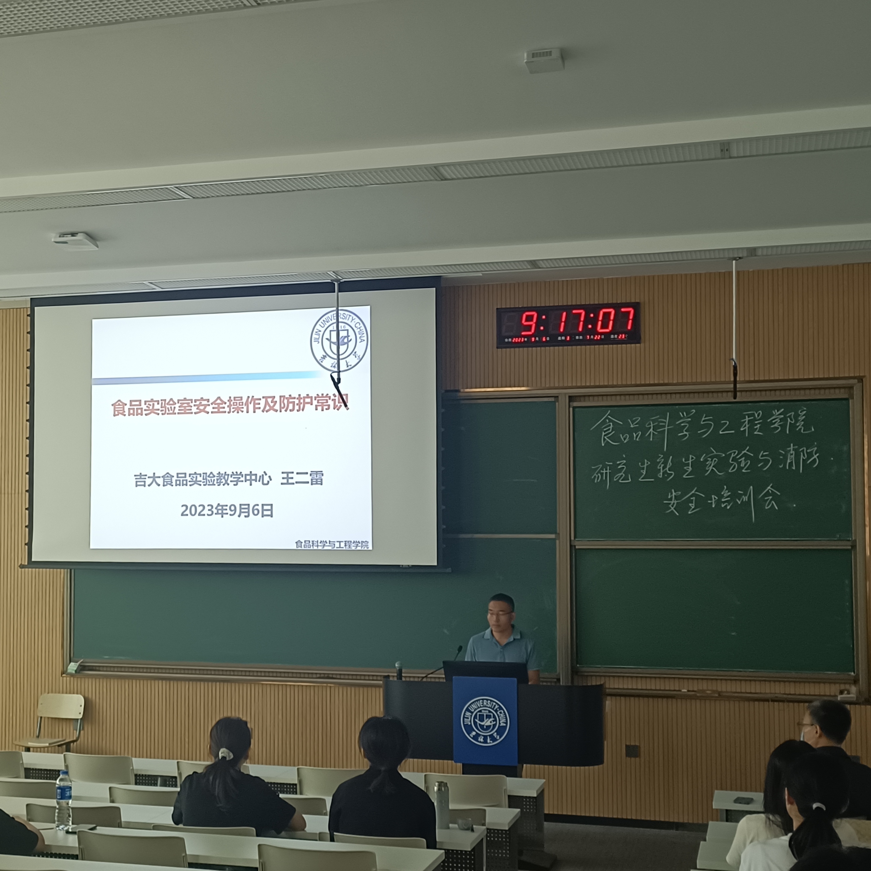 于科学讲堂200教室开展消防安全与实验室安全培训,科研副院长周亚军、行政副院长陈玉江、实验中心科研副主任王二雷老师以及全体2023级研究生参加会议。