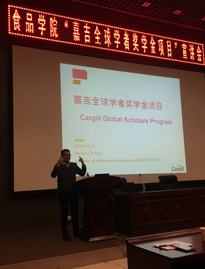 优秀学子 的风采。随后,包嘉博总监向学生宣讲了嘉吉集团的基本情况和企业文化,分享了自己和在嘉吉工作的其他校友的工作经验和体会,引起大家的广泛思考。最后,吴茂勤先生向与会同学介绍了“嘉吉全球学者奖学金项目”的设立过程、选拔标准、申报要求,分享了往届学者的心得,受到同学们的热烈欢迎。