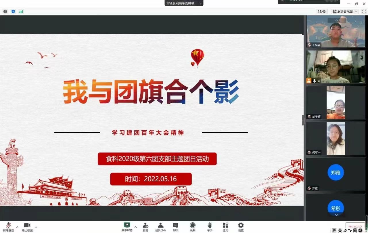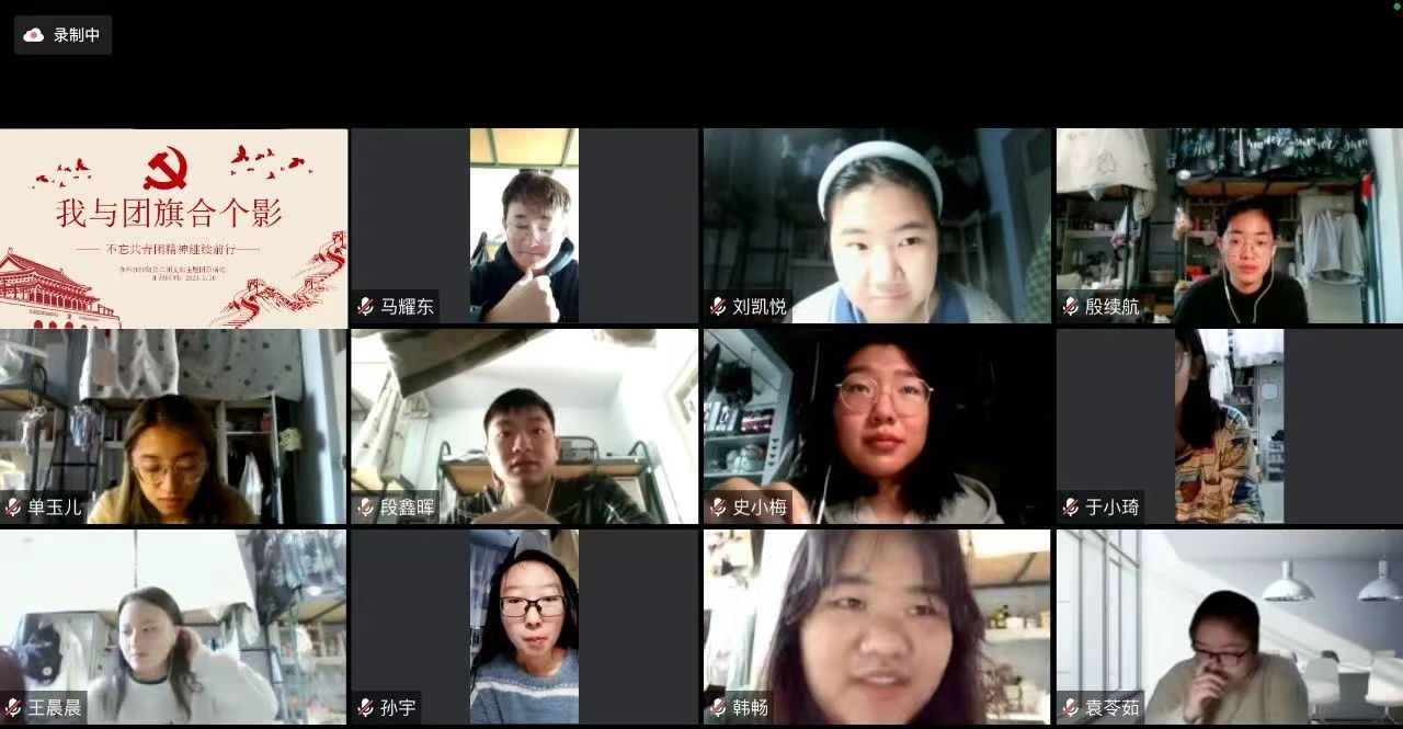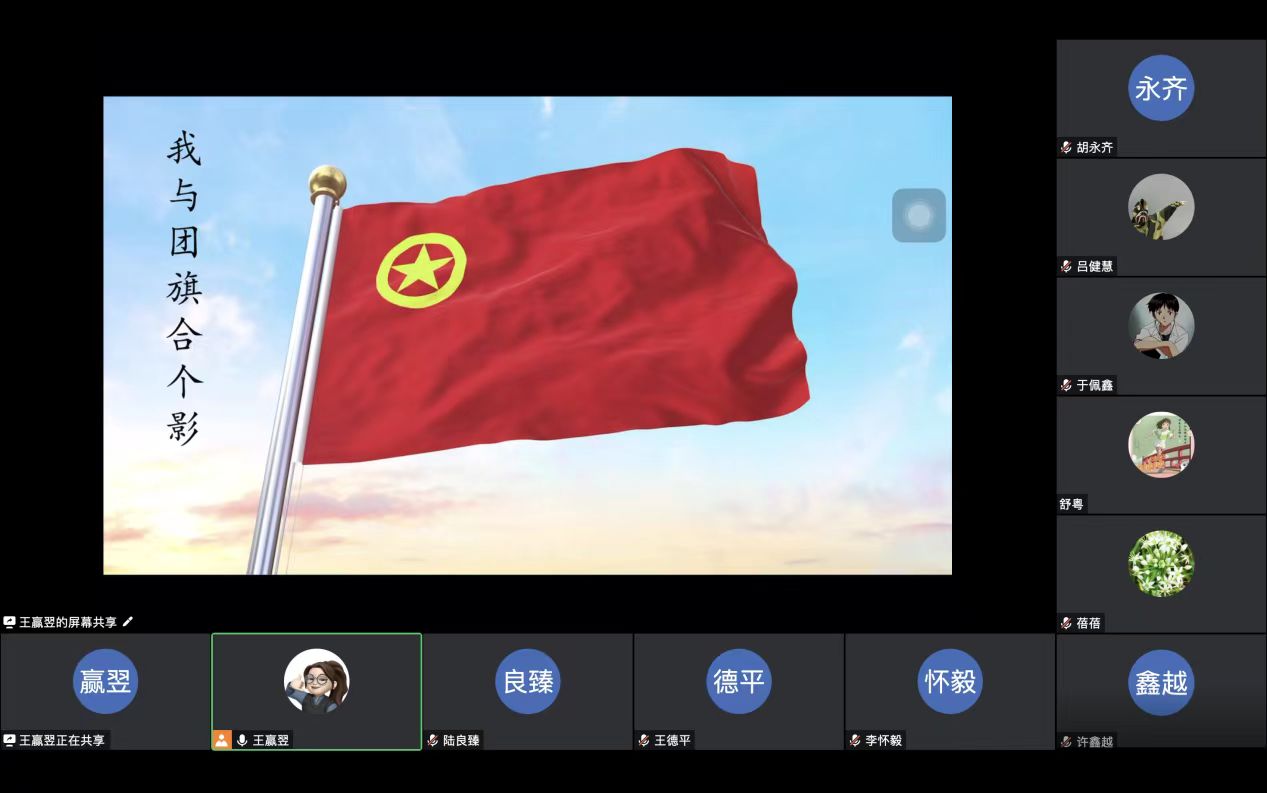 2020级第六团支部于2022年5月16日线上开展了以“我与团旗合个影”为主题的团日活动,一共有16位团员参加会议。会议上,同学们一起学习了习近平在庆祝中国共青团成立100周年大会上的重要讲话,了解共青团成立以来的百年征程,明白了共青团的带领作用对当代青年的历史意义,决意从我做起,自觉担当尽责,做有志青年,严格履行团员义务,以成长为一名合格的共产党员为光荣,为党和人民的事业发展贡献自己的一份力量。