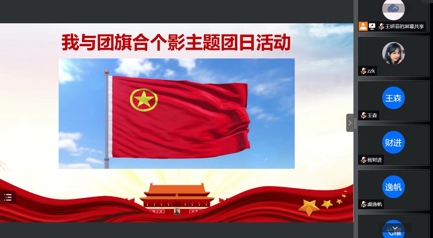 本科生2020级3班团支部于2023年5月18日组织开展了“我与团旗合个影”主题团日活动,本次团日活动在线上举行,团支书戴玥主持,2020级3班全体团员参加。