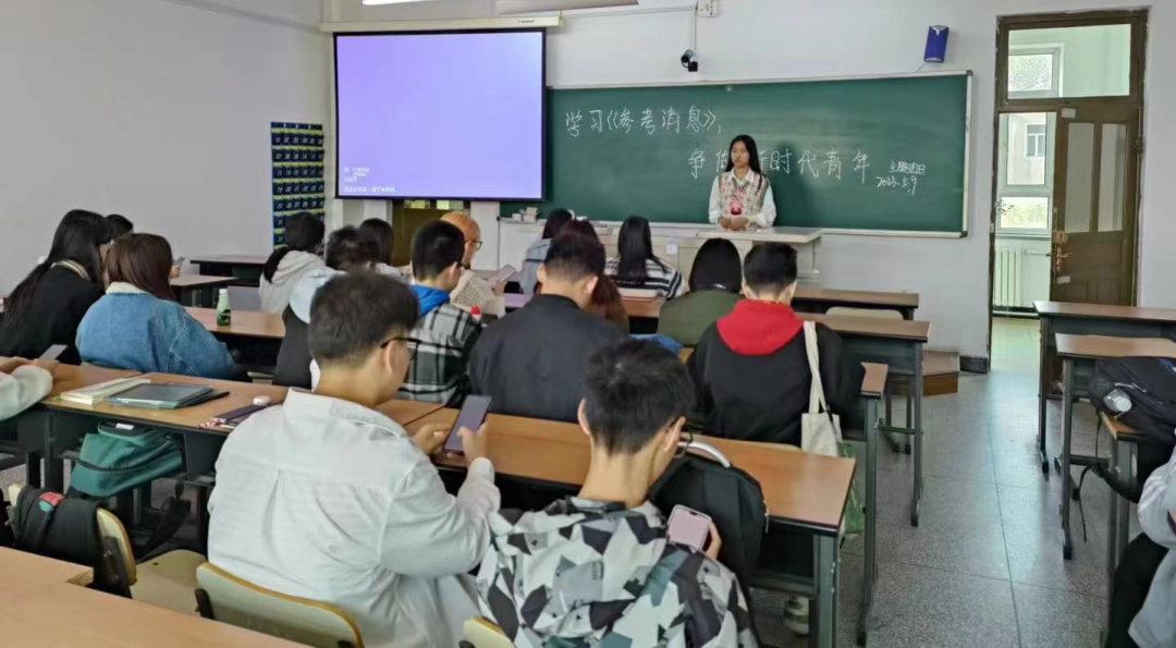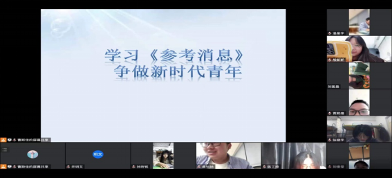 团支书向同学们介绍了《参考消息》的相关知识后,同学们一起认真观看视频学习,并分享自己的收获,在独立思考、积极探讨中对《参考消息》有了更加深入的了解,开阔了眼界,提高了思想觉悟和认识水平。