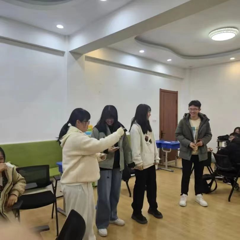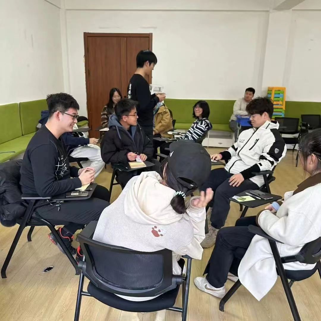 本次“心灵沟通”主题班会团体心理辅导在敬信楼A101心理团体活动室以班级为单位进行,分为“暖身阶段”与“班会阶段”。暖身阶段由各班心理委员担任主持人介绍此次班会的目的和性质,为大家分发带有心理中心图案的贴纸,同学们写上自己的组内昵称后,由主持人带领进行放松游戏,活跃班会气氛。在“情绪大头贴”环节,主持人组织同学随机抽取情绪卡片,同学们通过表演自己所抽到的情绪,由其他组同学猜测所对应的情绪卡片。通过暖身阶段,同学们放松了身心,同时在组内的沟通交流中表达情绪、辩识情绪。
