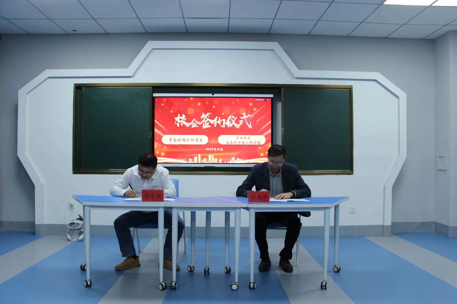 为充分发挥吉林大学食品科学与工程学院的科技、人才优势和青岛啤酒吉林省区的产业资源优势,2023年10月13日下午3时,青岛啤酒吉林省区与吉林大学食品科学与工程学院共建教室签约仪式在吉林大学和平校区管理楼206教室顺利举行。青岛啤酒吉林省区总经理赵雪刚、吉林大学食品科学与工程学院党委书记董怀智、院长张铁华及双方代表出席此次签约仪式。
