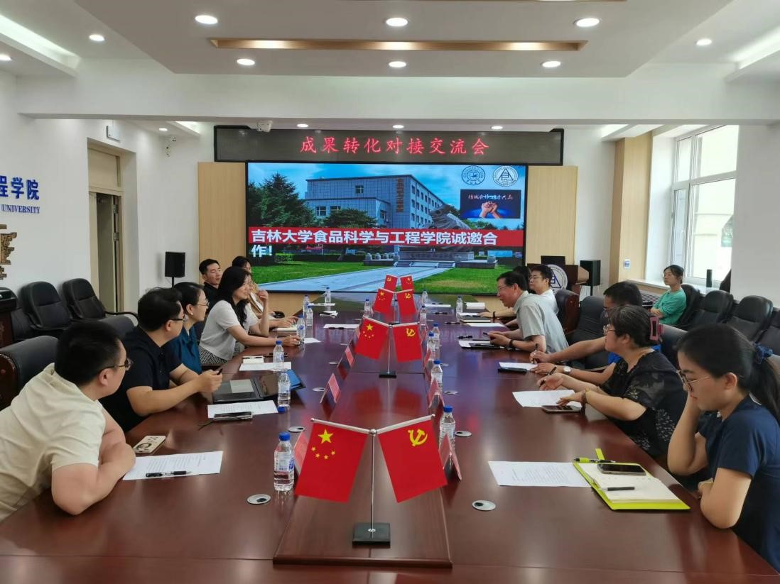 7月10日上午,吉大科研院科技开发办公室副主任王寿珍偕同吉浙合作科创服务中心秘书长曲雯婷及长春市企业富晟投资公司总监刘思克等一行人来到食品科学与工程学院,上门对接成果转化与交流。学院院长张铁华,副院长叶海青、孙春燕,食品安全系主任袁媛、教授董周永等人参加了交流。