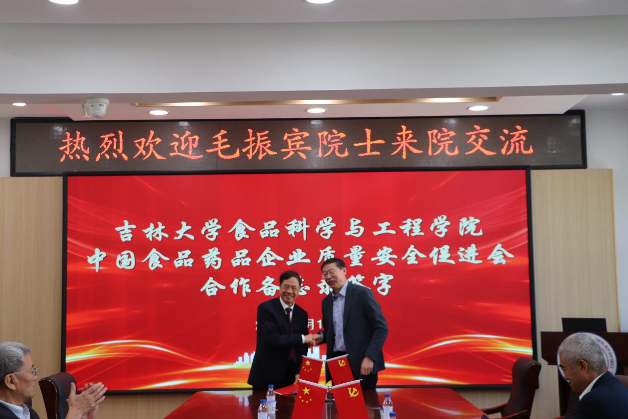 会后,毛振宾院士与张铁华院长在原解放军军需大学校长韩文瑜的见证下,正式签署了吉林大学食品科学与工程学院与中国食品药品企业质量安全促进会的合作备忘录。此次合作旨在加强双方在食品药品安全领域的科研合作、人才培养和资源共享,共同推动食品药品安全事业发展。