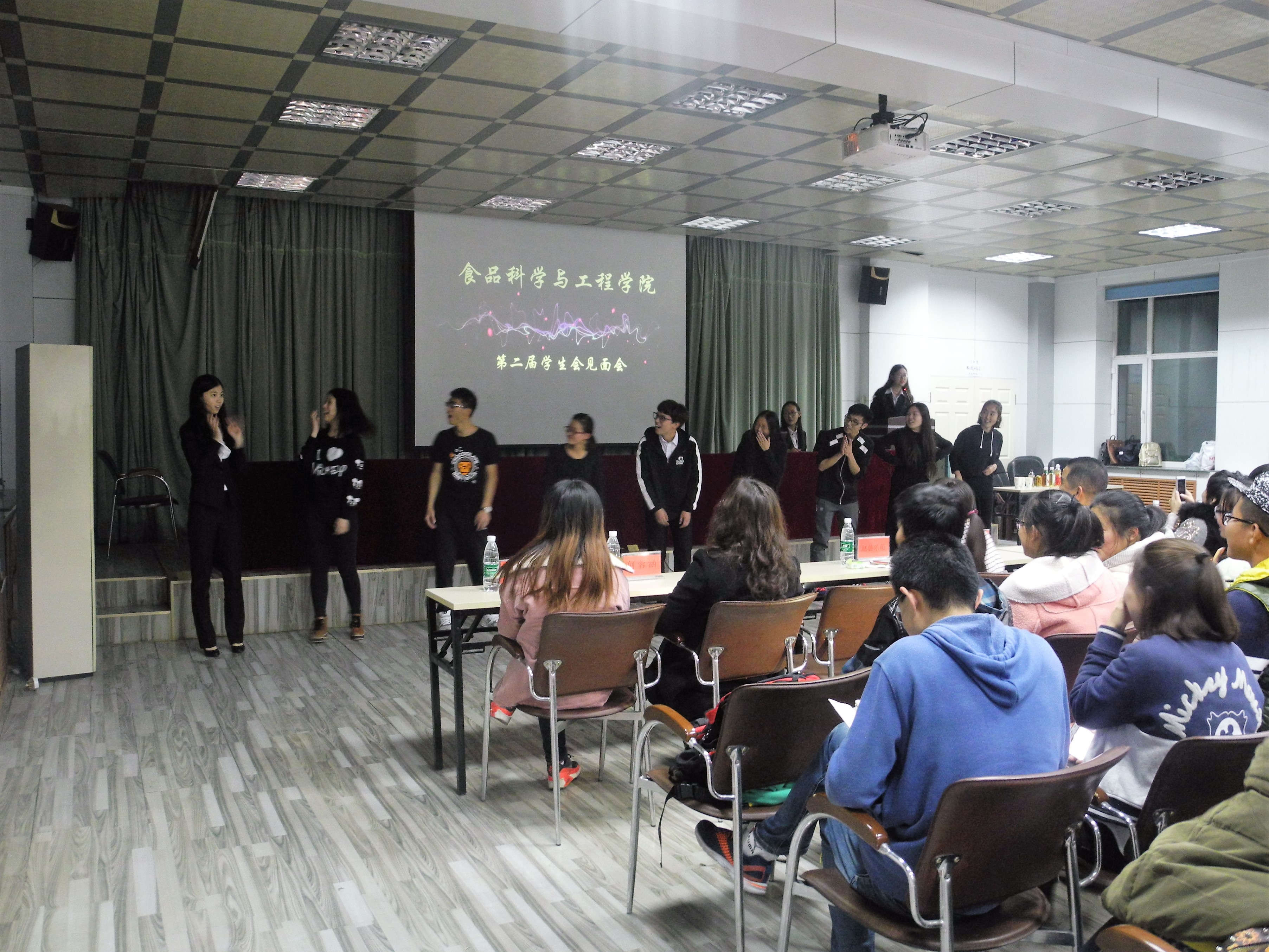 为展示食品科学与工程学院第二届学生会新成员风采,加强部门之间的交流。2016年10月23日晚,食品科学与工程学院学生会见面会于管理楼三楼会议室成功举办。学院党委副书记梅士伟、团委书记兼学工办主任王丹以及学院第二届学生会全体成员参加了此次活动。 活动中,各部门成员依次上台进行自我介绍,形式多样,内容丰富,涵盖了舞蹈、相声、歌曲等多个方面,获得了与会领导的高度肯定与赞扬。期间,穿插了“你与我的圈”、“演技不NG”两个小游戏增强了活动的趣味性,现场气氛高涨,掌声不断。最后,梅士伟老师和王丹老师分别就本次活动进行了点评,肯定了同学们的表现并表达了对同学们的美好祝愿和殷切希望;此外,梅士伟围绕“学生会成员有具备的素质”、“学生会的职能机制及方法改革”、“学生会的工作作风”三大主题向同学们提出了自己的要求,希望同学们能够找到工作与学习间的平衡,在保证学业的同时,认真完成学院学生工作。发言结束,与会领导与各位工作人员合影留念,见面会圆满结束。 本次见面会促进了学生会成员互相认识、相互了解,明确了未来的任务与目标,帮助新成员尽快适应学生会。相信在今后的学习生活中,新一届学生会将以最团结的态度以及最完美的姿态为食品科学与工程学院创造出更加美好的明天!