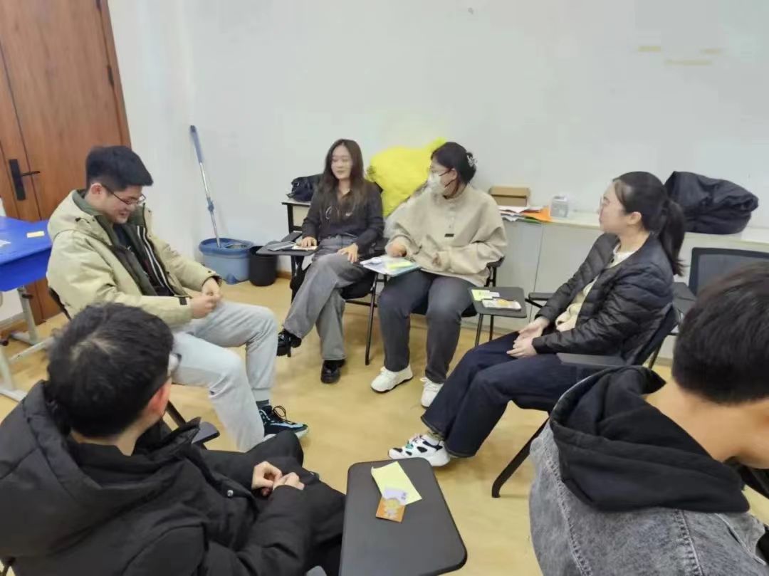 本次“心灵沟通”主题班会团体心理辅导在敬信楼A101心理团体活动室以班级为单位进行,分为“暖身阶段”与“班会阶段”。暖身阶段由各班心理委员担任主持人介绍此次班会的目的和性质,为大家分发带有心理中心图案的贴纸,同学们写上自己的组内昵称后,由主持人带领进行放松游戏,活跃班会气氛。在“情绪大头贴”环节,主持人组织同学随机抽取情绪卡片,同学们通过表演自己所抽到的情绪,由其他组同学猜测所对应的情绪卡片。通过暖身阶段,同学们放松了身心,同时在组内的沟通交流中表达情绪、辩识情绪。