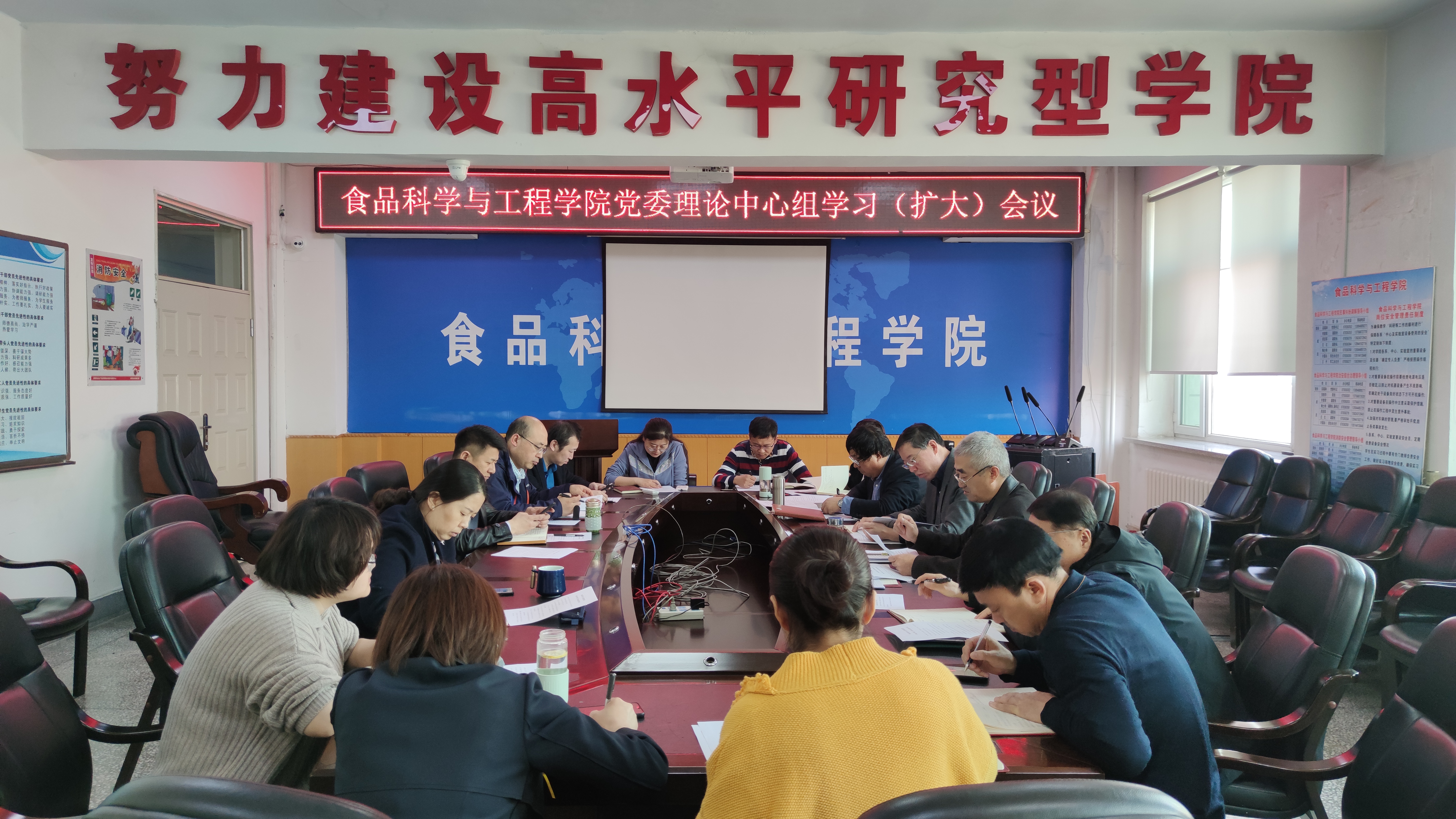 根据学校《关于学习贯彻2021年学校工作会议暨第八届教职工代表大会第四次会议精神的通知》要求,2021年3月31日下午14时,食品科学与工程学院在食品楼三楼会议室召开党委理论中心组学习(扩大)会议。学院党政领导班子成员、院学术委员会主任委员、院学位评定委员会主席、院教学委员会主任委员、各办公室、系(中心)、教研室主任参加了会议。会议由学院党委书记董怀智主持。
