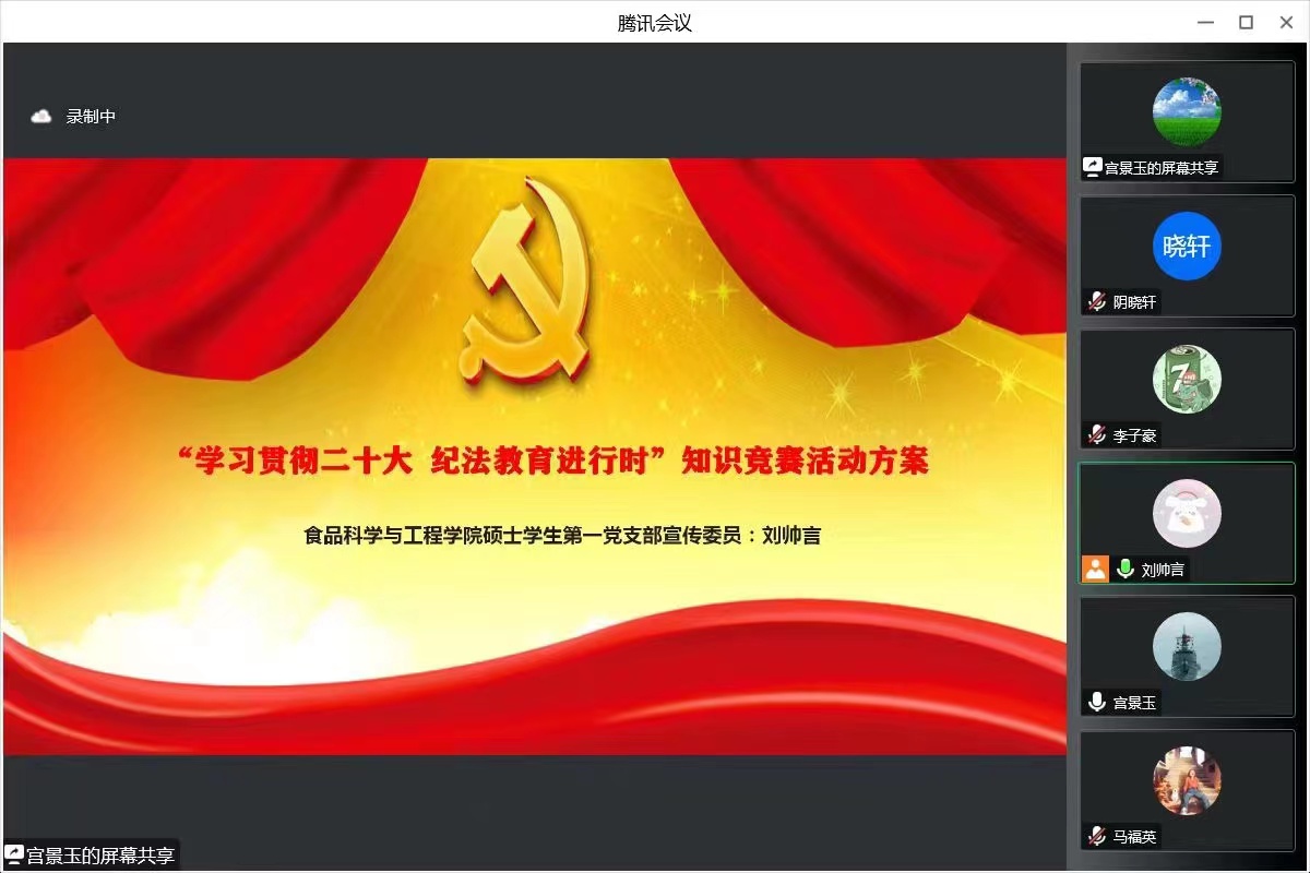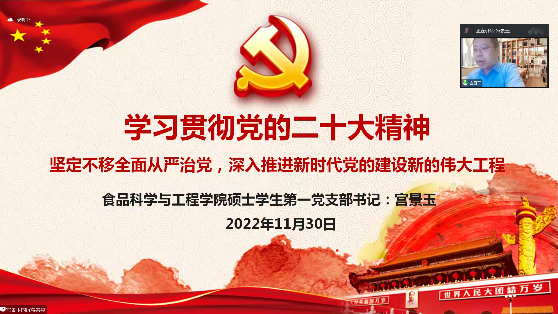 为深入学习宣传贯彻党的二十大精神,全面贯彻习近平新时代中国特色社会主义思想,坚定不移推进全面从严治党。2022年11月30日下午,食品科学与工程学院硕士学生第一党支部通过腾讯会议召开十一月主题党日活动。支部全体党员参加,会议由支部书记宫景玉主持。