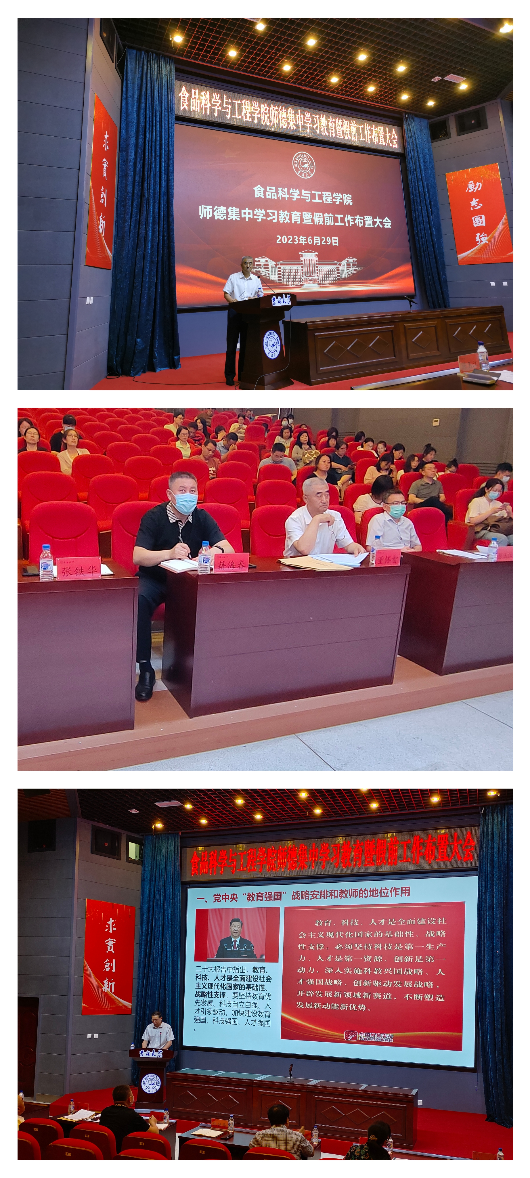 为深入学习贯彻习近平新时代中国特色社会主义思想,贯彻学习习近平总书记关于教育的重要论述和指示批示精神,坚决落实师德师风第一标准,引导广大教职工牢固树立“以德立身、以德立学、以德施教”教育理念,争做“四有”好老师,根据校党委教师工作部《关于在全校开展师德集中学习教育的通知》(校教师字〔2023〕12号)要求,6月29日下午,食品科学与工程学院召开师德集中学习教育暨假前工作布置大会,学校主题教育第十二巡回指导组副组长、学校党建工作联络员籍海春同志列席指导。学院全体教职工参加了本次大会,会议由学院党委书记董怀智主持。