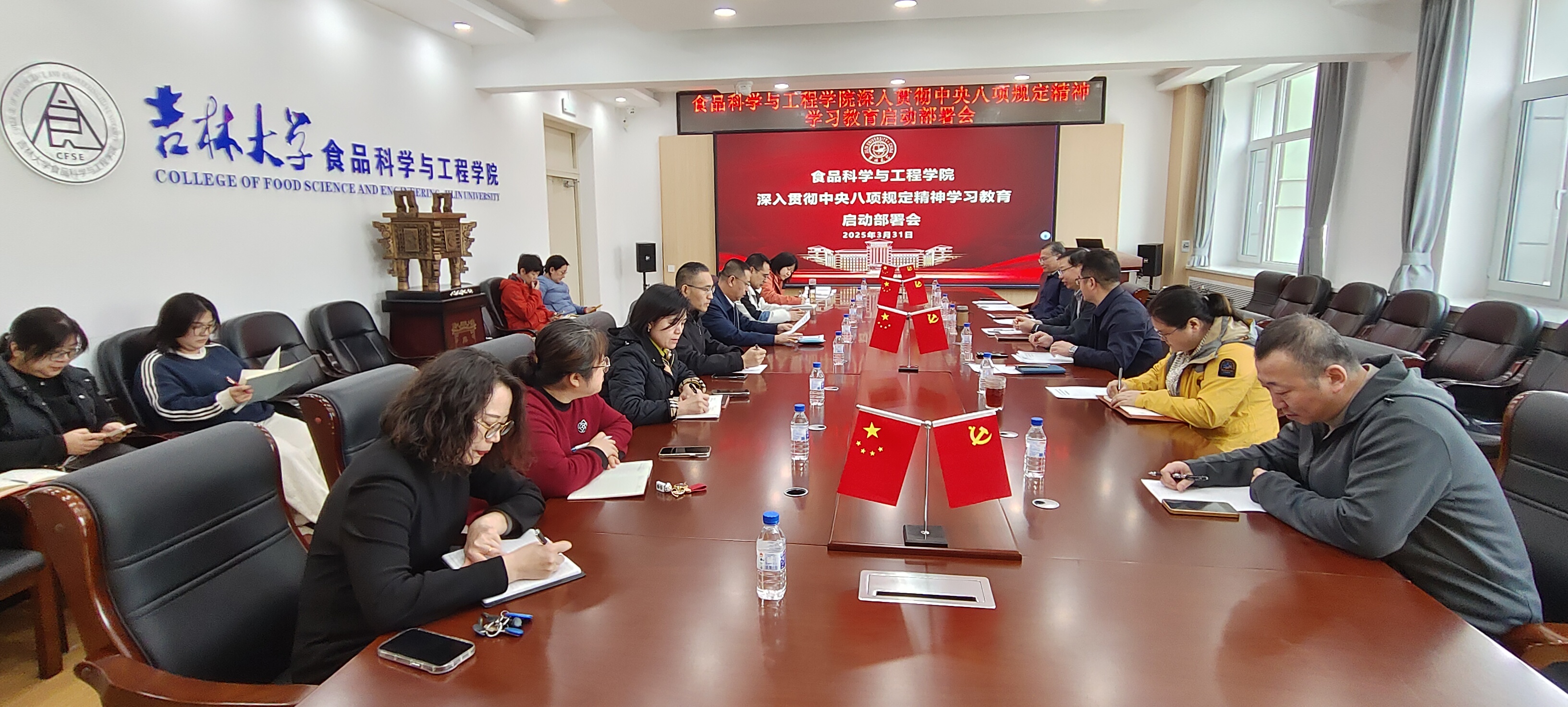 会上,梅士伟带领与会人员共同学习了《十八届中央政治局关于改进工作作风、密切联系群众的八项规定》。院长张铁华传达了吉林大学深入贯彻中央八项规定精神学习教育启动部署会会议精神,对《食品科学与工程学院深入贯彻中央八项规定精神学习教育实施方案》进行了重点解读。副院长叶海青传达了吉林大学2025年全面从严治党工作会议暨警示教育大会会议精神。